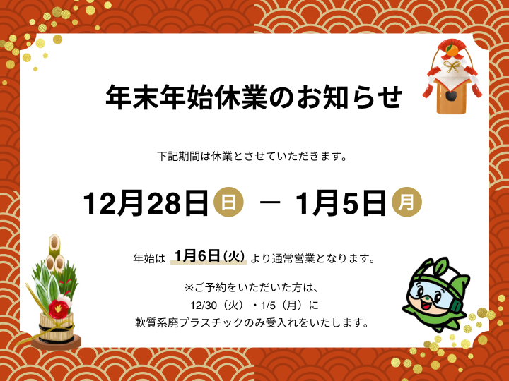 お知らせ NEWS HOME > お知らせ > 新着情報 > 年末年始休業期間のお知らせです。 新着情報 2025.12.03 年末年始休業期間のお知らせです。 いつもコスモリサイクルをご利用いただき、誠にありがとうございます。 年末年始の休業期間について、下記の通りご案内いたします。 2025年12月28日(日)〜2026年1月5日(月) 上記期間は通常の受入れ業務をお休みさせていただきます。 ご利用の皆さまにはご不便をおかけいたしますが、何卒よろしくお願い申し上げます。 ※ご予約をいただいた方は、12/30(火)・1/5(月)に軟質系廃プラスチックのみ受入れをいたします。 前へ < 一覧に戻る ACCESS アクセス コスモリサイクル株式会社 所在地 〒492-8441 愛知県稲沢市福島町沢西95-1